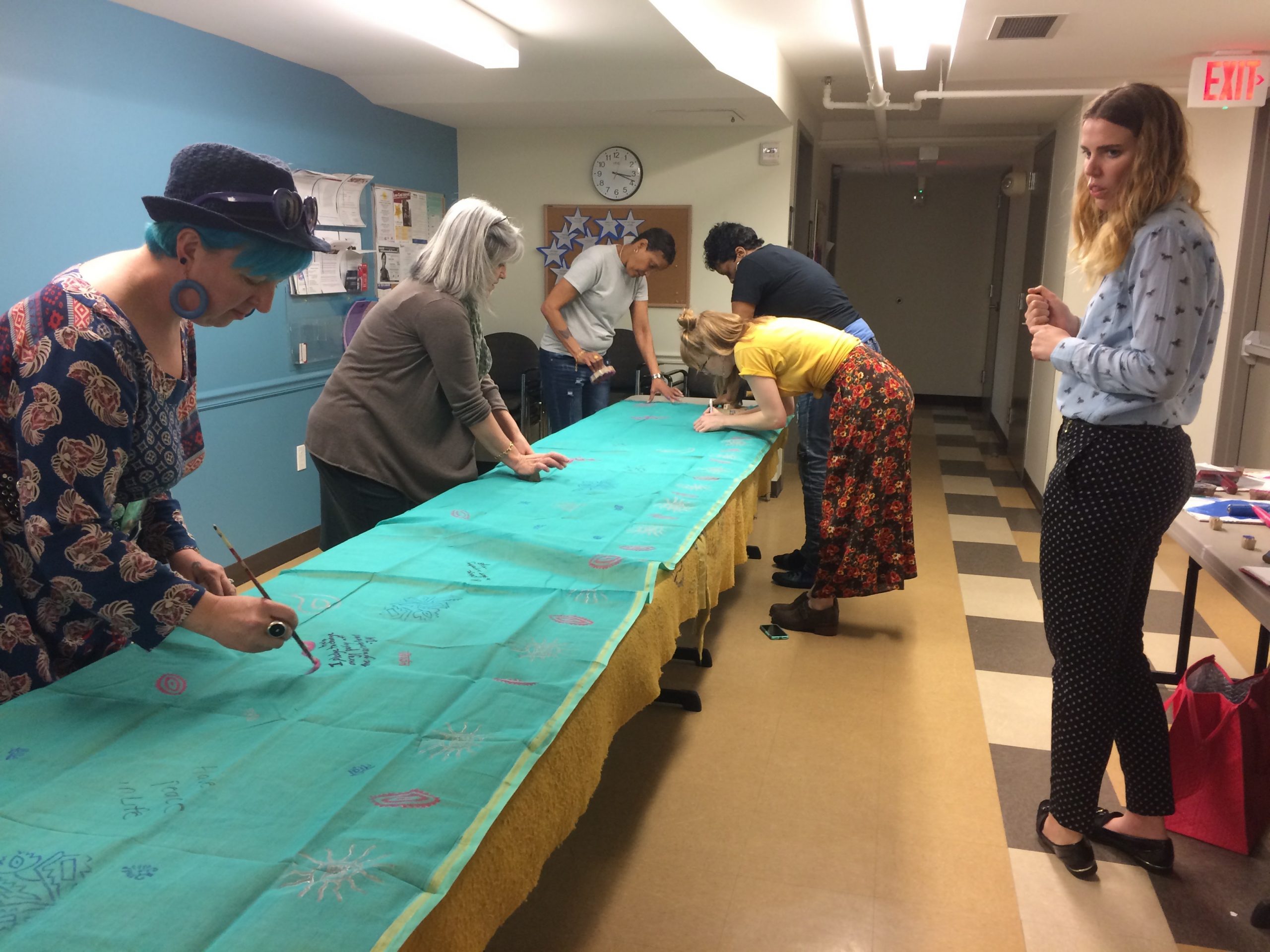The women discussed climate change as part of an audio visual presentation that shared stories of the impacts of climate change on the coastal women of Katakhali, Bangladesh. They learned about the causes of climate change, the basic tenets of the Paris Agreement, the impact of the election on the agreement, and the ways in which communities are adapting in Bangladesh and in the US (e.g., Miami Beach and Louisiana). The participants learned about the main contributors to green house gases in the US and ways in which individuals can mitigate climate change through changes in their own lives. The women watched a film about the women of Katakhali, “Her Words: Storytelling with Saris,” while creating their own sari covered with woodblock, hand painting, and hand written pledges to reduce carbon footprint. The women of the shelter made pledges such as “I will turn off the lights”, “I will walk more,” and “I will recycle.”