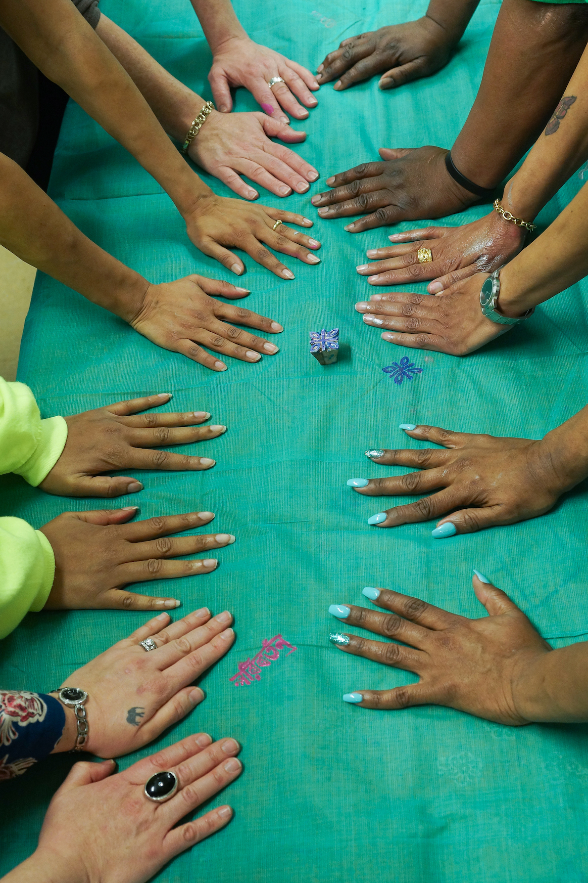 The women were excited to learn the woodblock technique and decided to use alternating wood blocks (an eye design and a sun with solar panel) to create the border. Many of the women painted woman power imagery in the body of the sari.