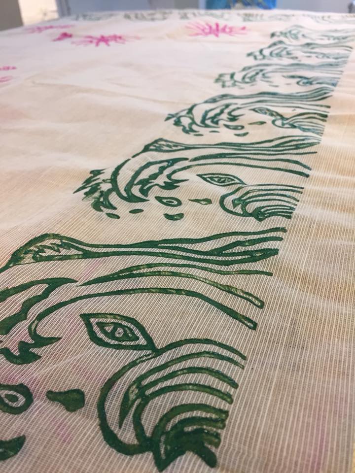 During the day, visitors/participants took part in an art action to make a collaborative sari with woodblock printing and handwritten climate pledges. The sari was later sewn together with other saris, constituting an alternative climate agreement of climate pledges in English, Bengali, and French, created by individuals united in cross-border solidarity.