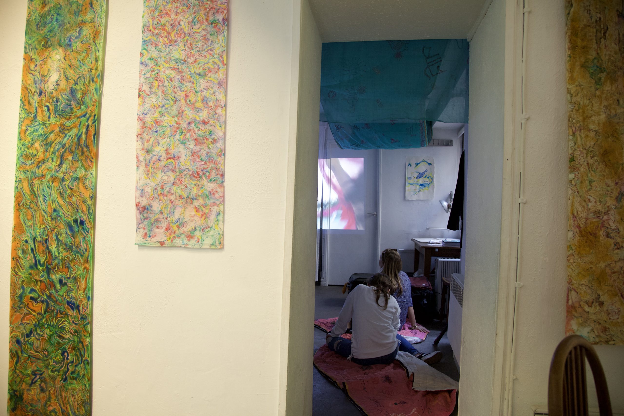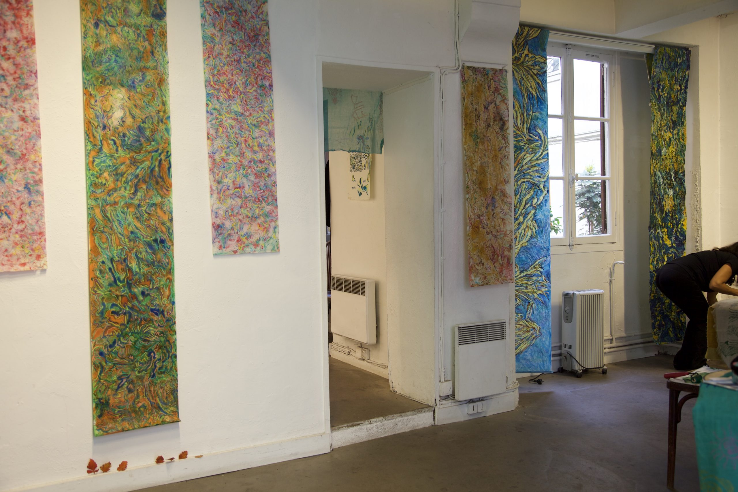Deux Degrés is a collective response to climate change, in solidarity with the planet. Bose and Chaudhuri, one based in Washington DC and the other in Paris, collaborate with Paris residents and women from Bangladesh in an art action that blends saris, writing, drawing, and printmaking. When she lived in Paris, Bose learned printmaking from Chaudhuri, a painter and master printmaker. The installation includes Bose’s saris made in collaboration with people in Bangladesh, Hawaii, the US, and France, Chaudhuri’s paper scrolls with drawing and painting, etchings by Chaudhuri, combination prints by Bose, and collaborative prints with watercolor that Bose and Chaudhuri created together in Paris.