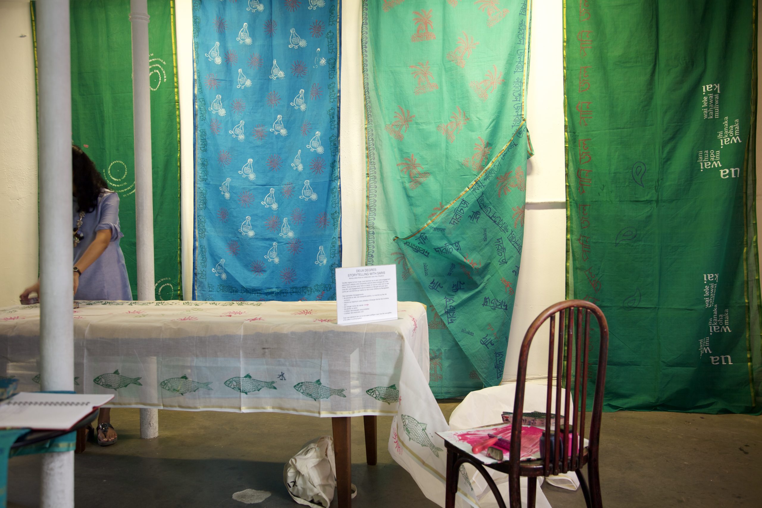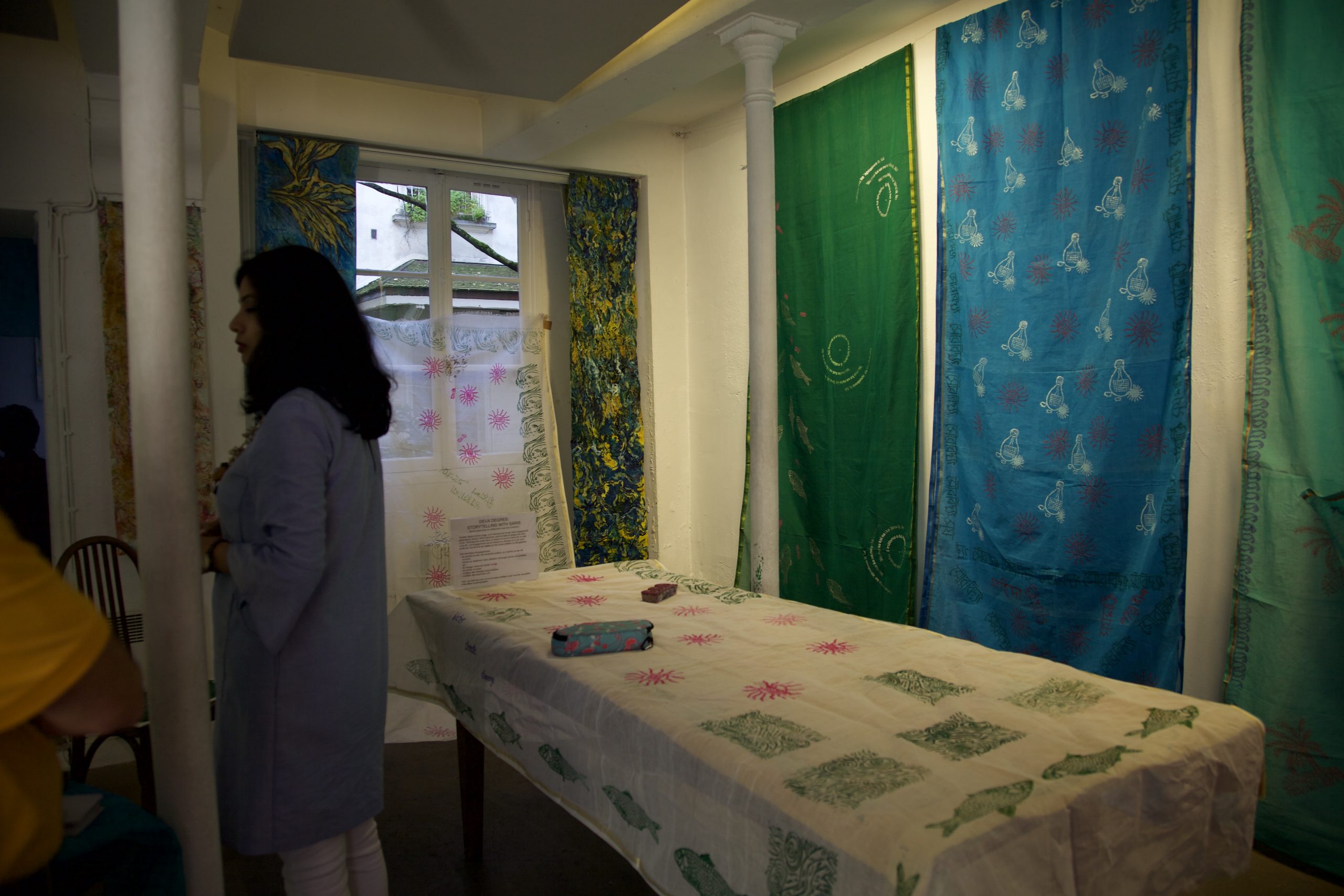 Deux degrés est une réponse collective au changement climatique, en solidarité avec la planète. Bose et Chaudhuri, l’une à Washington et l’autre à Paris, collaborent avec les habitants de Paris et les femmes du Bangladesh dans une action artistique qui mèle saris, écriture, dessin, et gravure. Alors qu’elle vivait à Paris, Bose s’est formée à la gravure auprès de Chaudhuri, artiste peintre et maître de la gravure. Les saris, portant des inscriptions en bengali, français et anglais, constituent un accord alternatif, crée par des individus unis, qui dépasse les frontières.