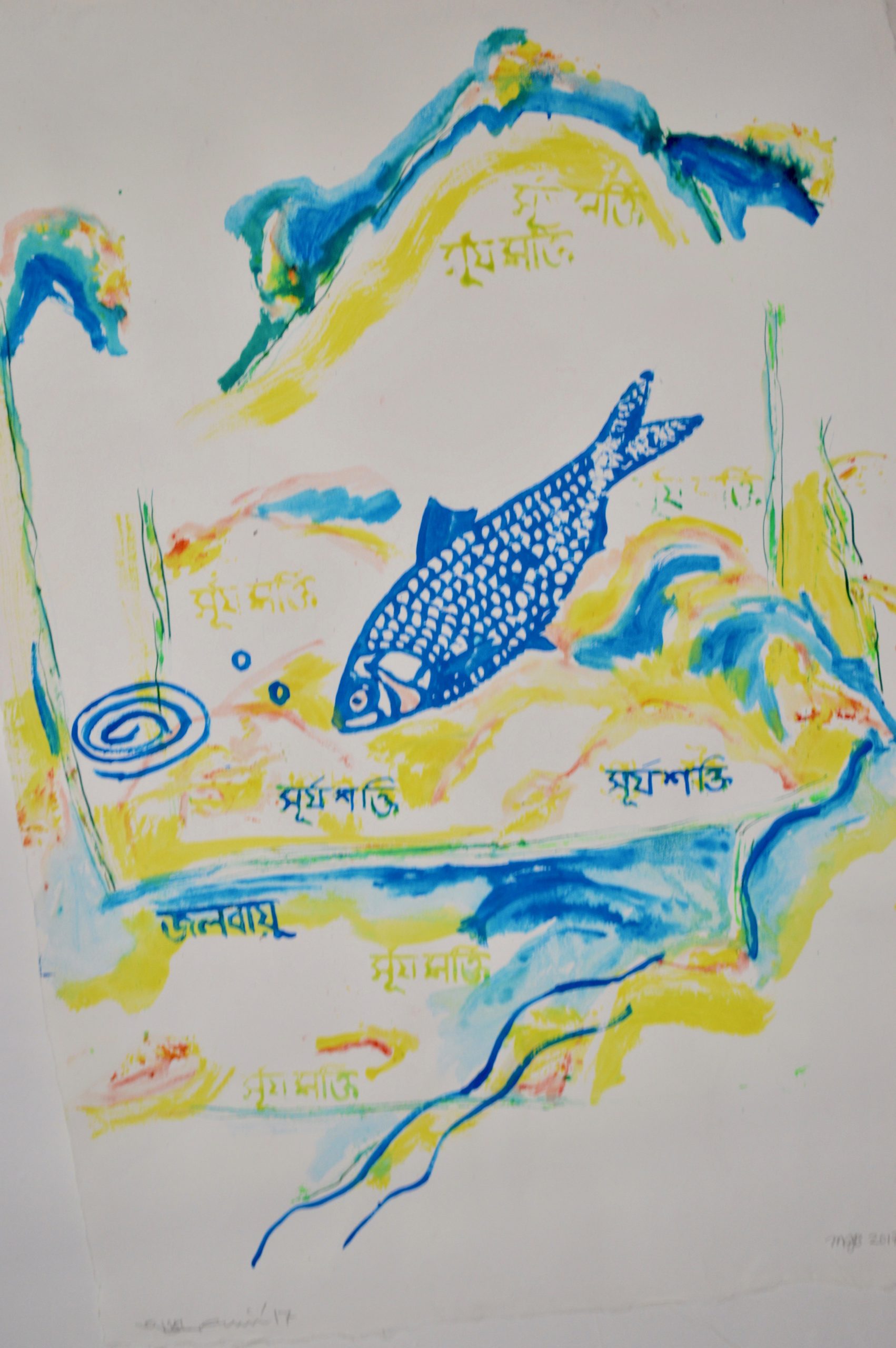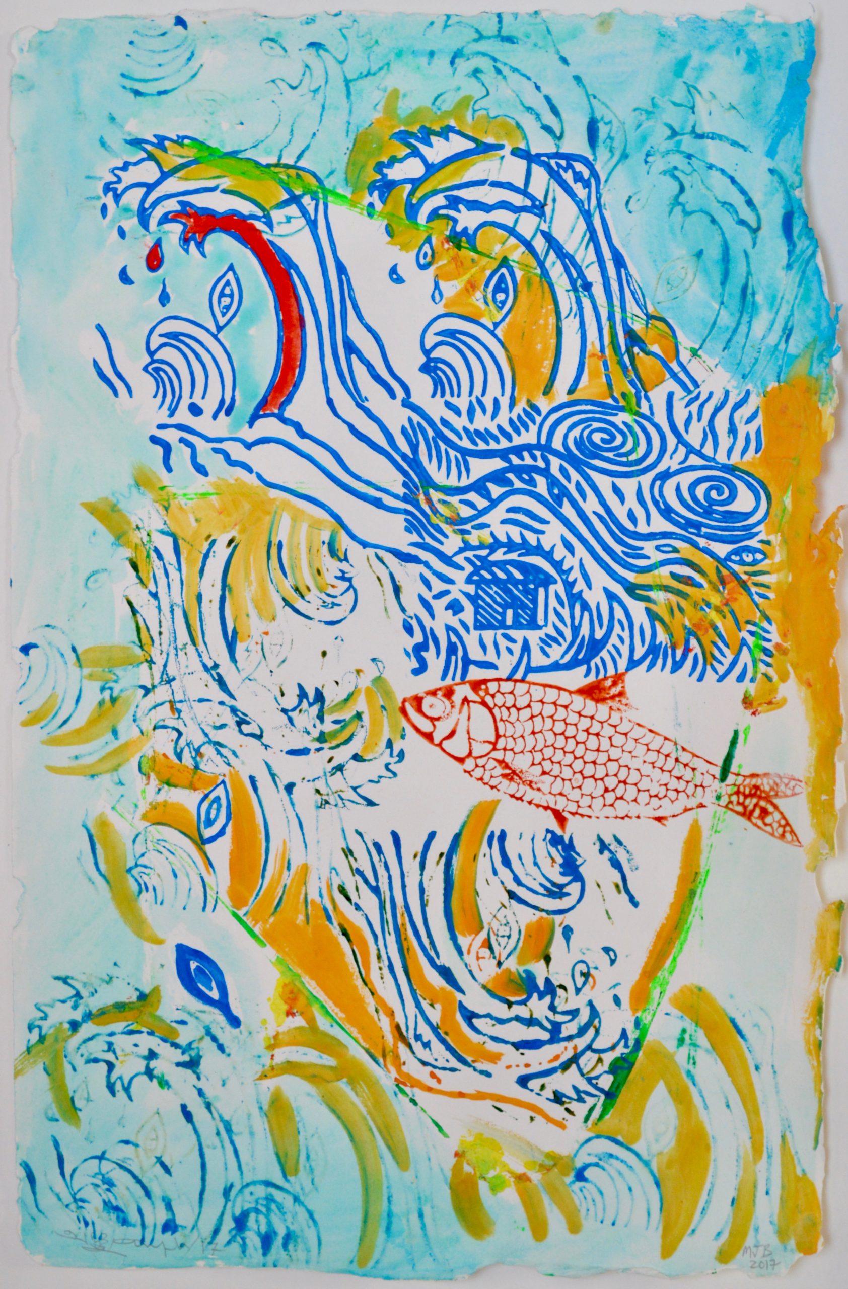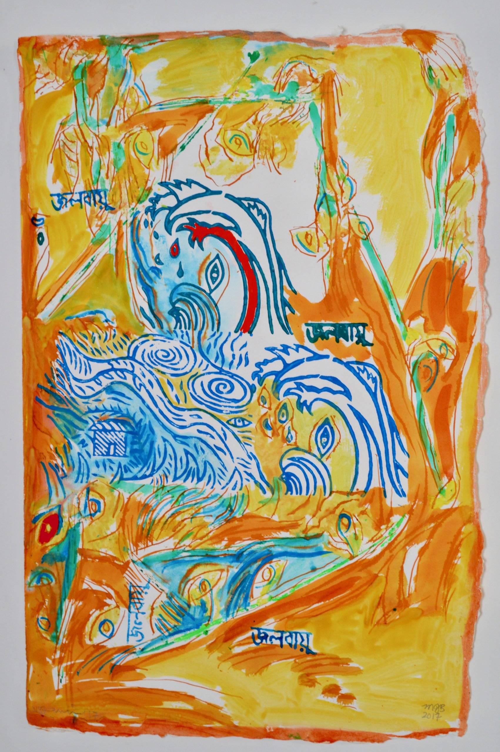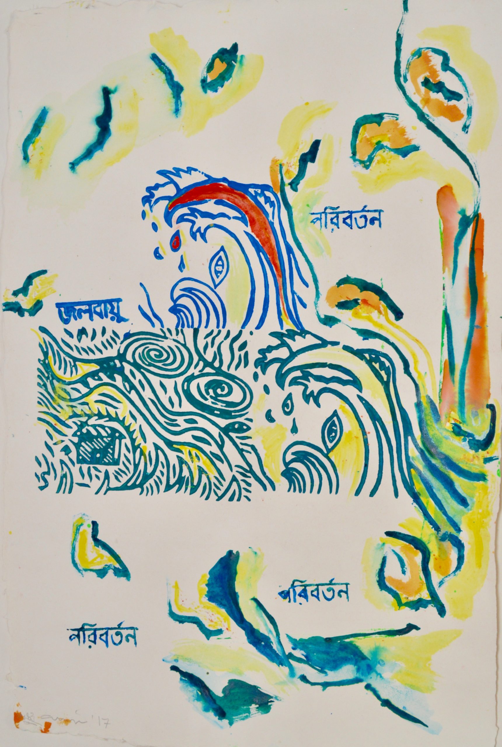 The four following pieces are collaborative works on paper by Chaudhuri and Bose using woodblock and watercolor on handmade paper from Bangladesh.