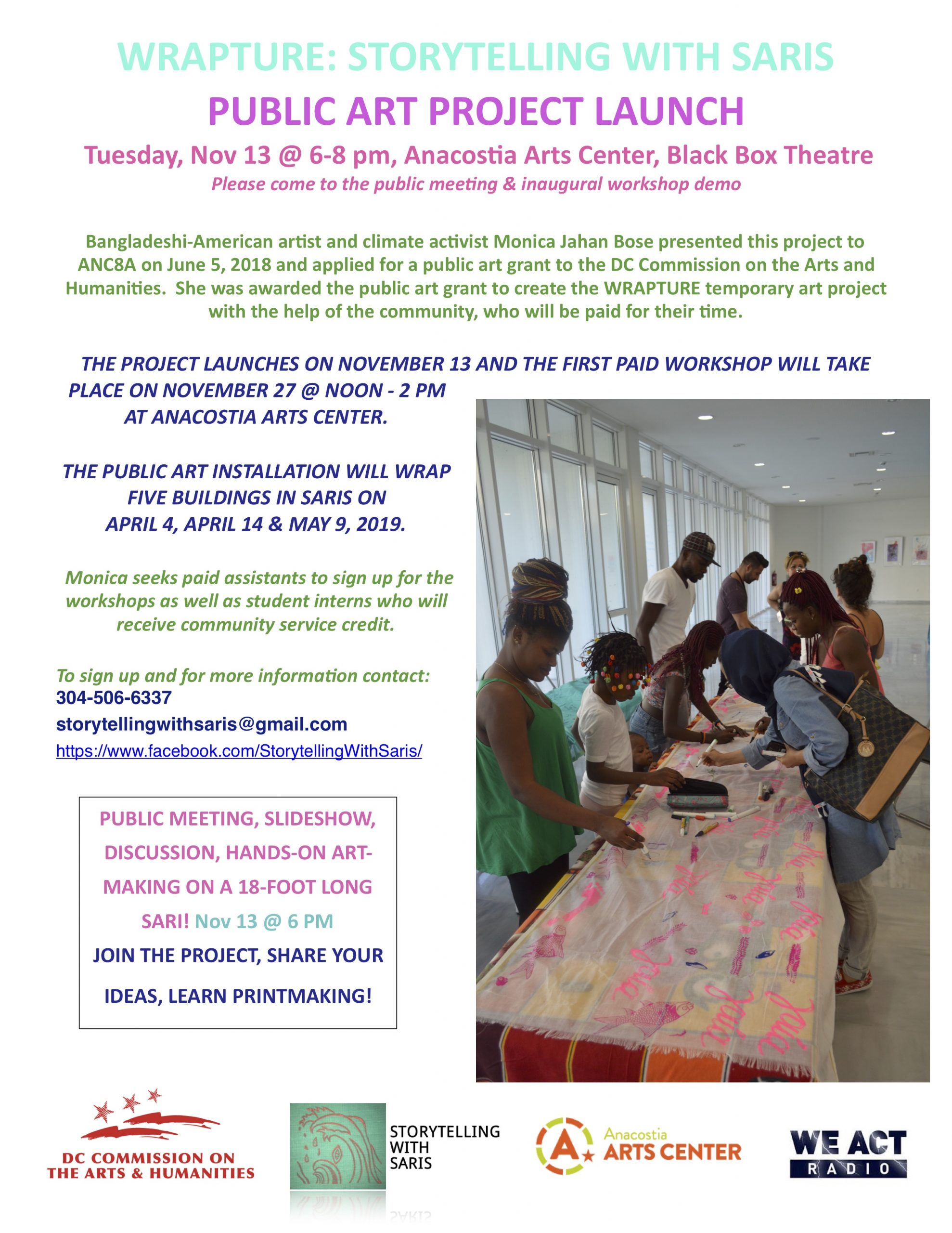 We are so excited to launch WRAPTURE, a public art project supported by the DC Commission on the Arts and Humanities, which is supported by the NEA. The public launch event is on November 13 @ 6 pm at the Anacostia Arts Center. We will be making saris with the community for several months and then sari-wrapping five Anacostia buildings in the spring. Stay tuned and join us on November 13! The project team includes Monica Jahan Bose, Amy Lokoff, Karen Baker, Camille Kashaka, Kymone Tecumseh Freeman and our partners include Anacostia Arts Center, We Act Radio, and Calvary Women’s Services. We are grateful to have this opportunity from the DC Commission on the Arts & Humanities to create a temporary public art installation with DC residents.