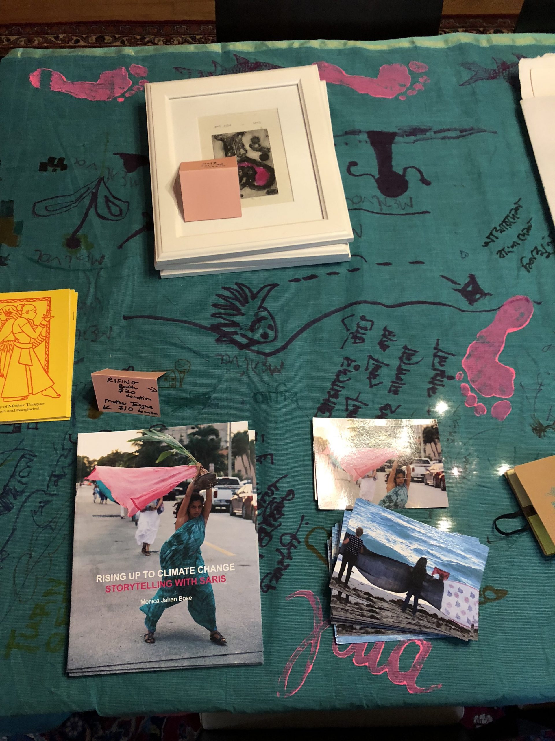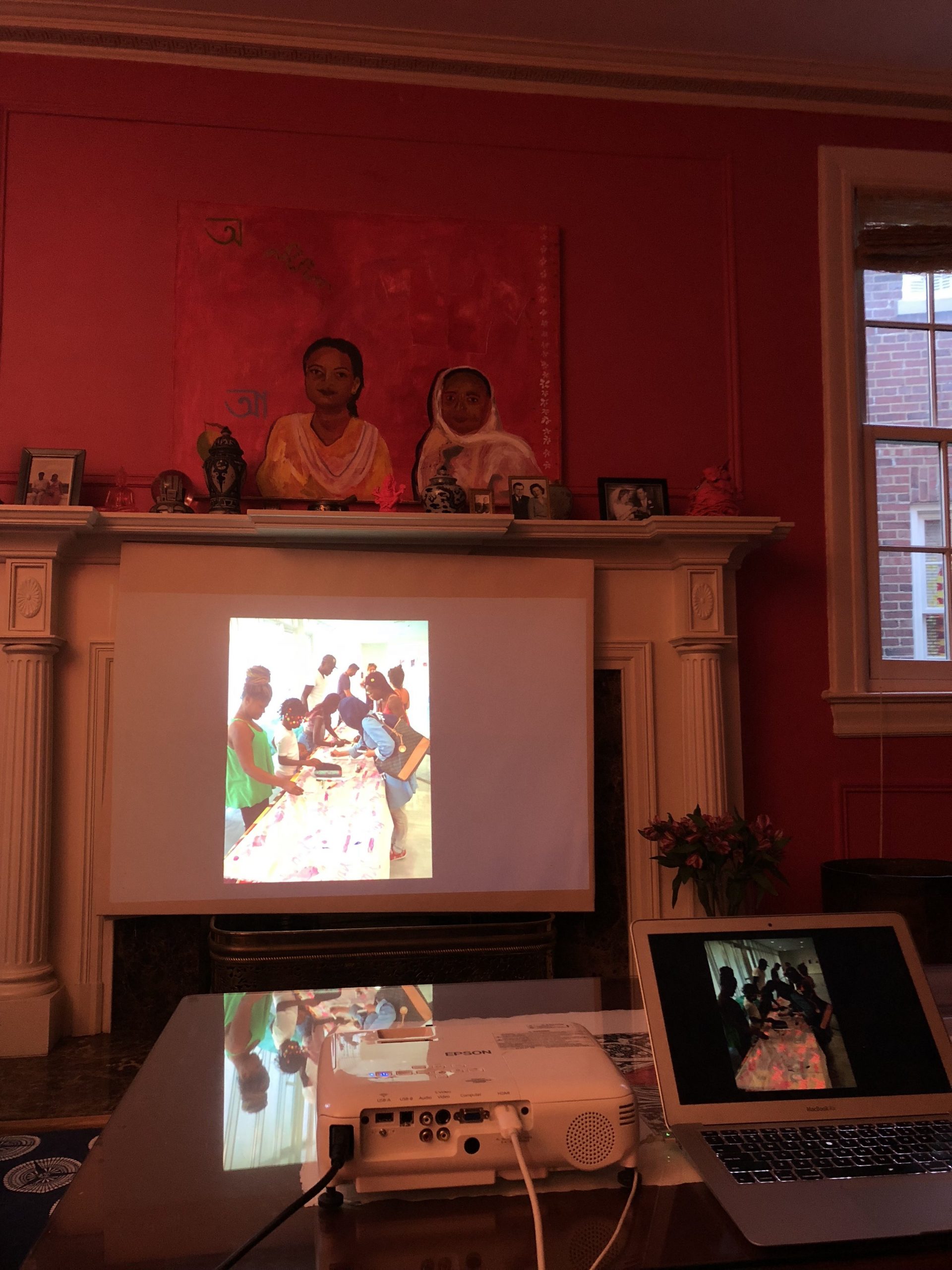 We also had several artists attend who are fellows at Halcyon Art Lab. Many were interested in learning strategies for how to engage with communities around an art project. It was also interesting to speak to writer Cynthia Houston, who was surprised to learn that coastal people in Katakhali, Bangladesh assumed that extreme storms and heat were acts of God but have recently learned about the causes of climate change through a Storytelling with Saris workshop. Now they understand that the world “has a fever” because richer countries are burning too much fuel. We also discussed the growing approach of many environmentalists to reach out to faith-based communities to build alliances to combat climate change.