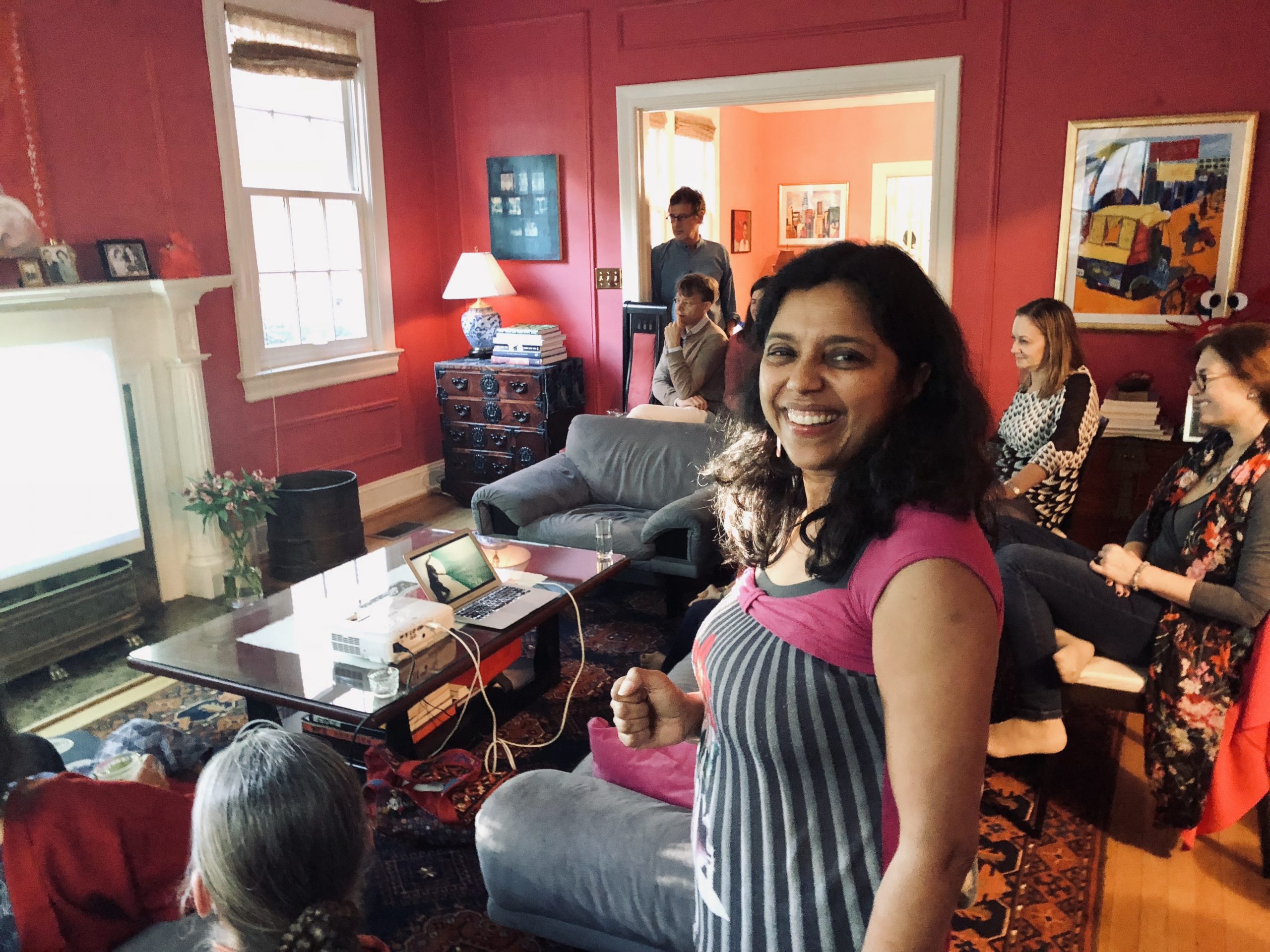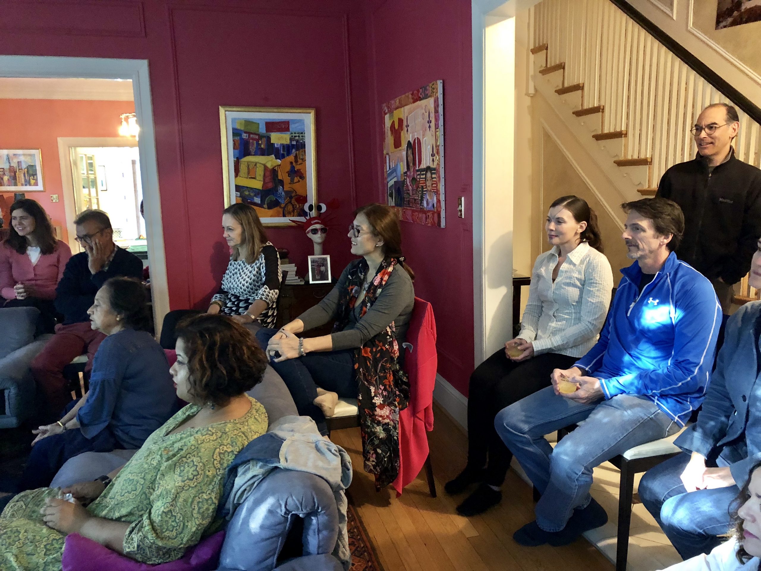 I was so delighted to spend the afternoon with you in my hot pink living room. The Storytelling with Saris Fall Salon, held on the afternoon of Saturday, October 13, 2018, was a fun cocktail gathering that generated some excellent ideas about how to address climate change as a community as part of an art project. We had 13 people attending the salon for the first time, and many repeat salon participants for a total of 25-30 attendees. We shared images and video from Athens, including the beautiful video of the workshop SHELTER with refugee women put together by Angeliki Grammatikopoulou and the slideshow of the Home-Spiti-Bari performance made by Evi Athanasiou. The exhibition Footprint-Apotipoma was supported by a Sister Cities Grant from the DC Commission on the Arts and Humanities, the Mayor’s Office of Athens, and the Office of Refugees of the Athens Municipality. We also showed video from the Smithsonian’s AE KAI project in Hawaii. Finally, the salon provided an opportunity to share my sketches and get everyone’s ideas for the new DC public art project WRAPTURE which is launching on November 13 in Anacostia and is supported by the DC Commission on the Arts and Humanities.