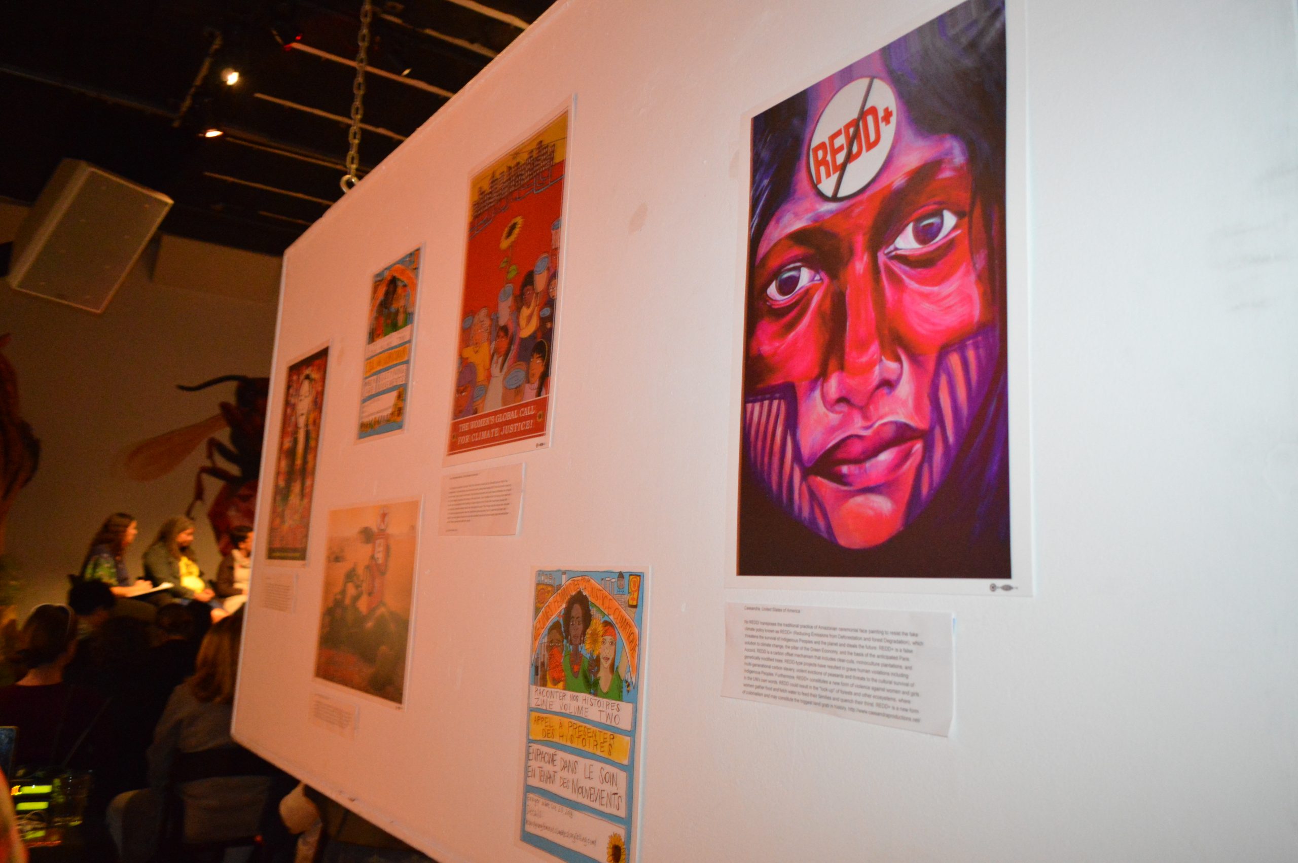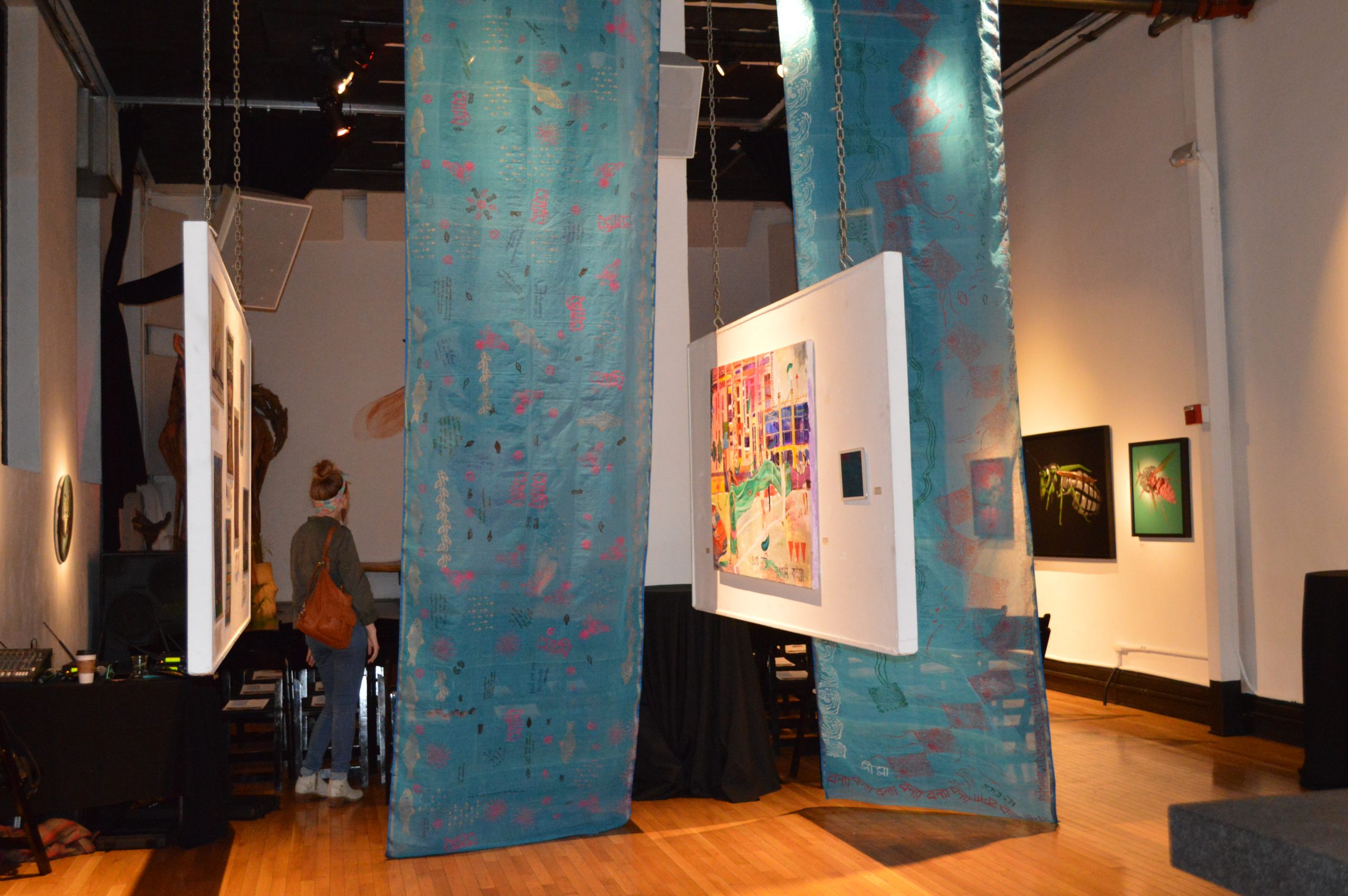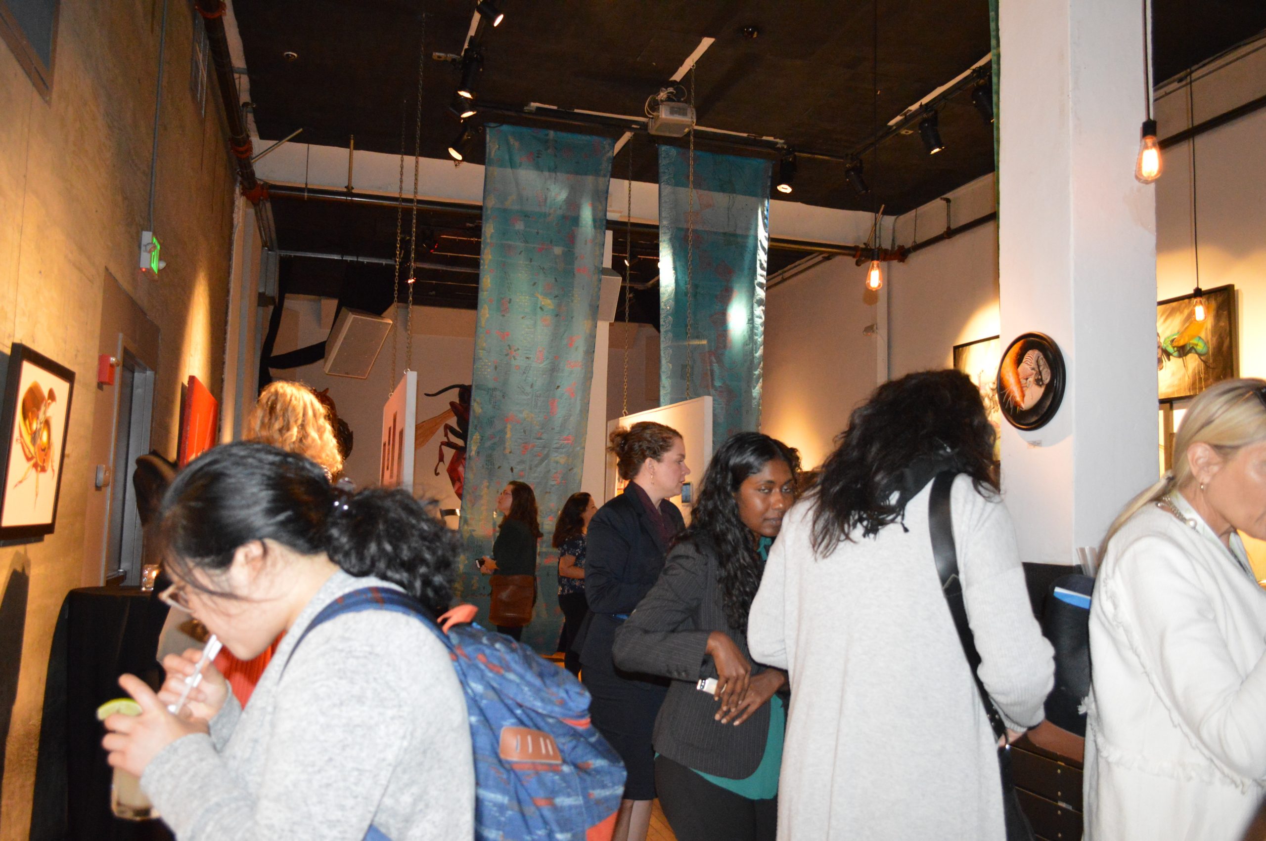 The art included two large paintings by Monica Jahan Bose from the series “Weather the Storm,” the performance video Jalobayu (2014, Miami, in collaboration with One Billion Rising Miami), as well as artwork, zines, and posters from the Young Feminist Fund(FRIDA), global storytelling project. The existing work in the gallery — apocalyptic insect/animal machine blends by Robert Bowen — was also eerily appropriate for the climate change theme.
