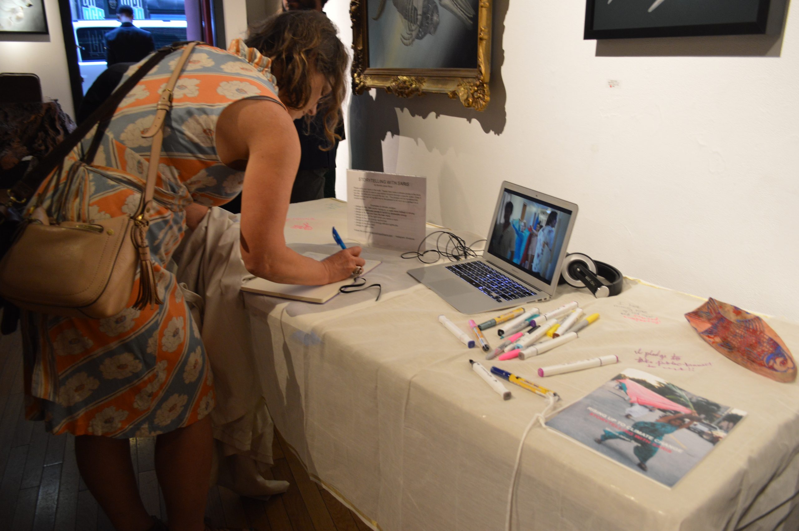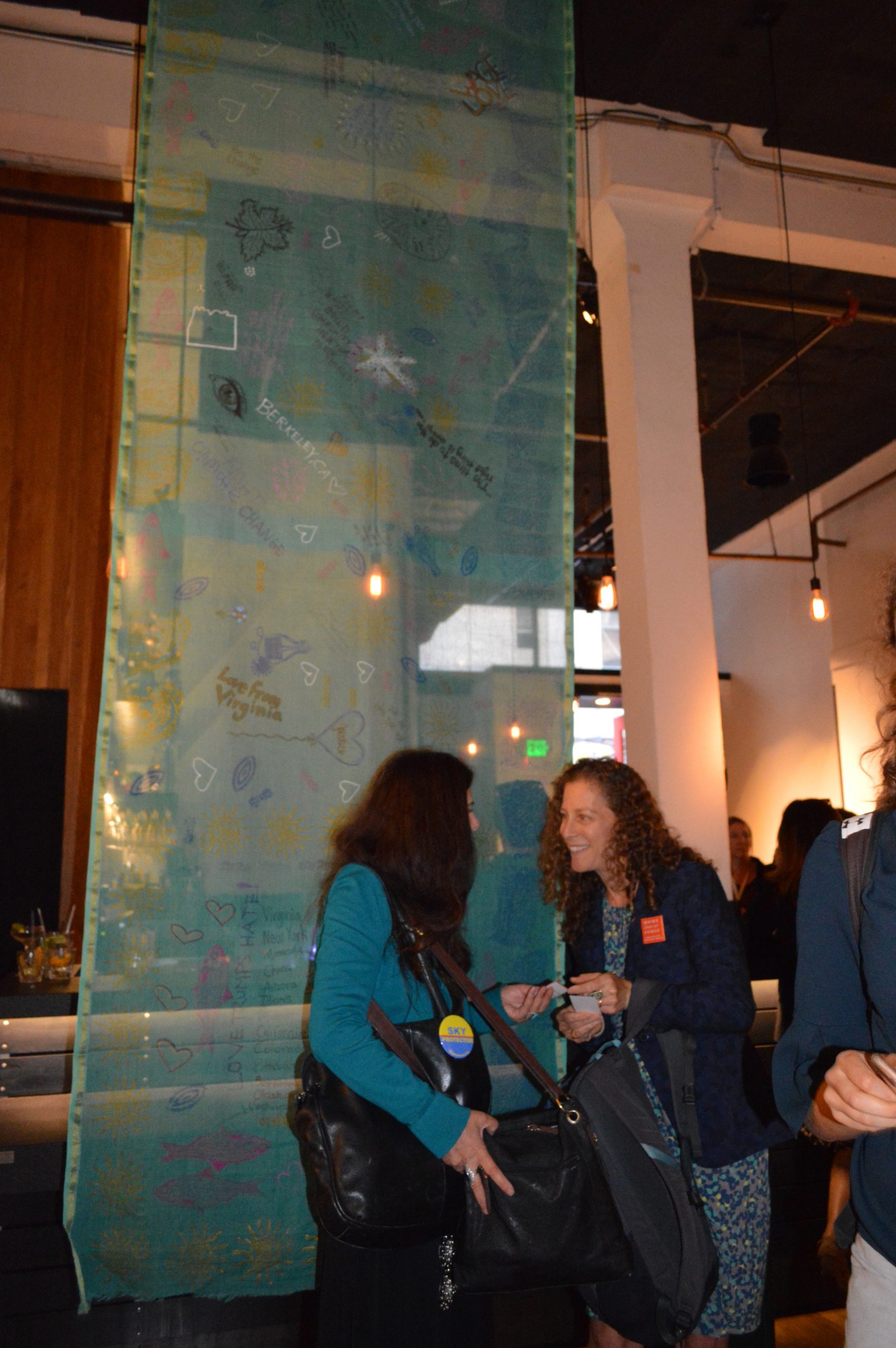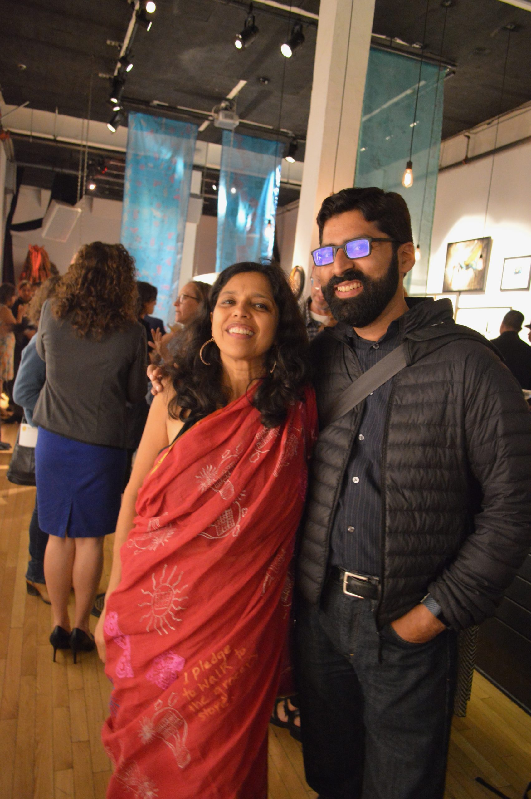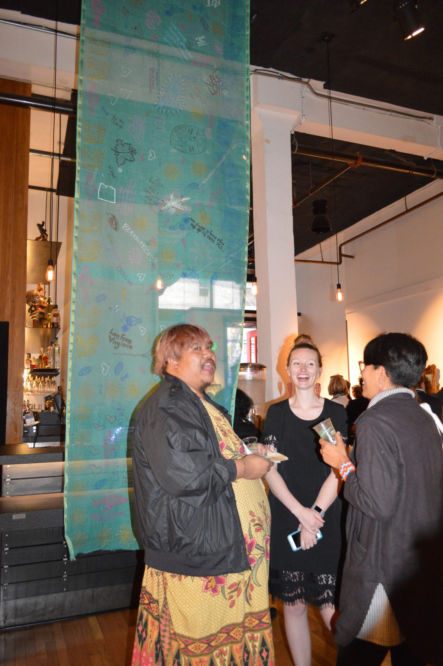 “We are not drowning. We are thriving.” This was the chant at the end of the evening. Almost 200 people gathered together for four hours on September 13, 2018 to highlight women’s leadership in addressing climate change, an event hosted by the Sierra Club’s Gender Program and Women’s Environment and Development Organization (WEDO) in conjunction with the Global Climate Action Summit organized by California Governor Jerry Brown. The venue was 111 Minna Gallery, a dramatic art space that was perfect for hanging the 18-foot-long Storytelling with Saris climate saris. Two saris on display were made in collaboration with Sierra Club’s Youth Activists during their trips to Washington DC in 2016 and 2017. The third sari was made in collaboration with women from Katakhali Village, Bangladesh. During the evening, attendees made individual climate pledges on a cotton handloom sari, which will ultimately be returned to Bangladesh and worn by a woman on the frontlines of climate change in Katakhali Village, Barobaishdia Island.