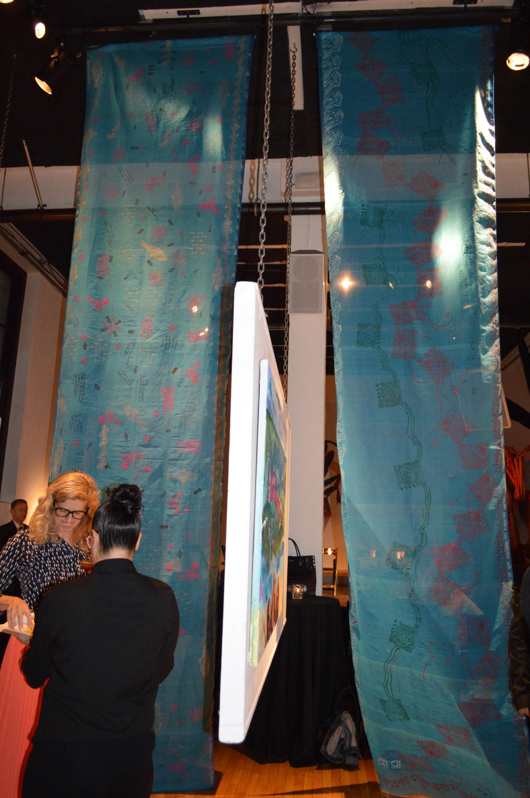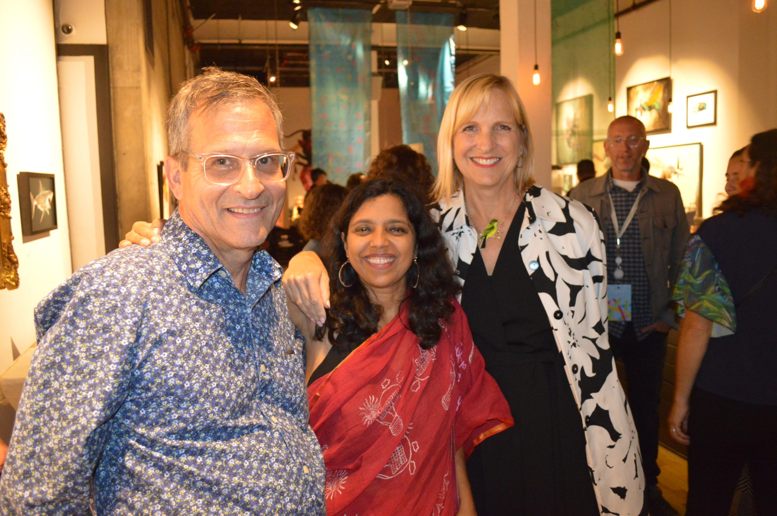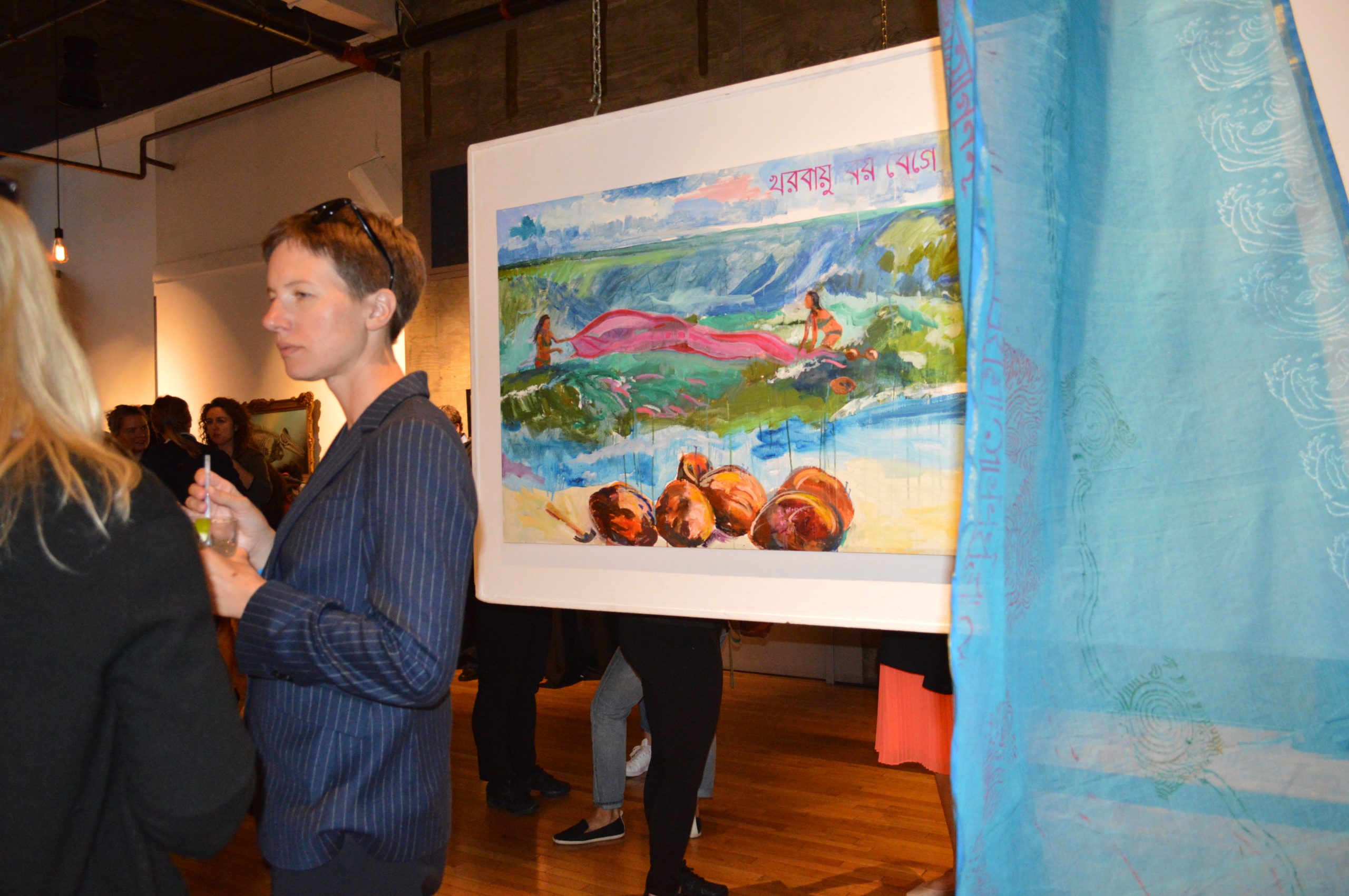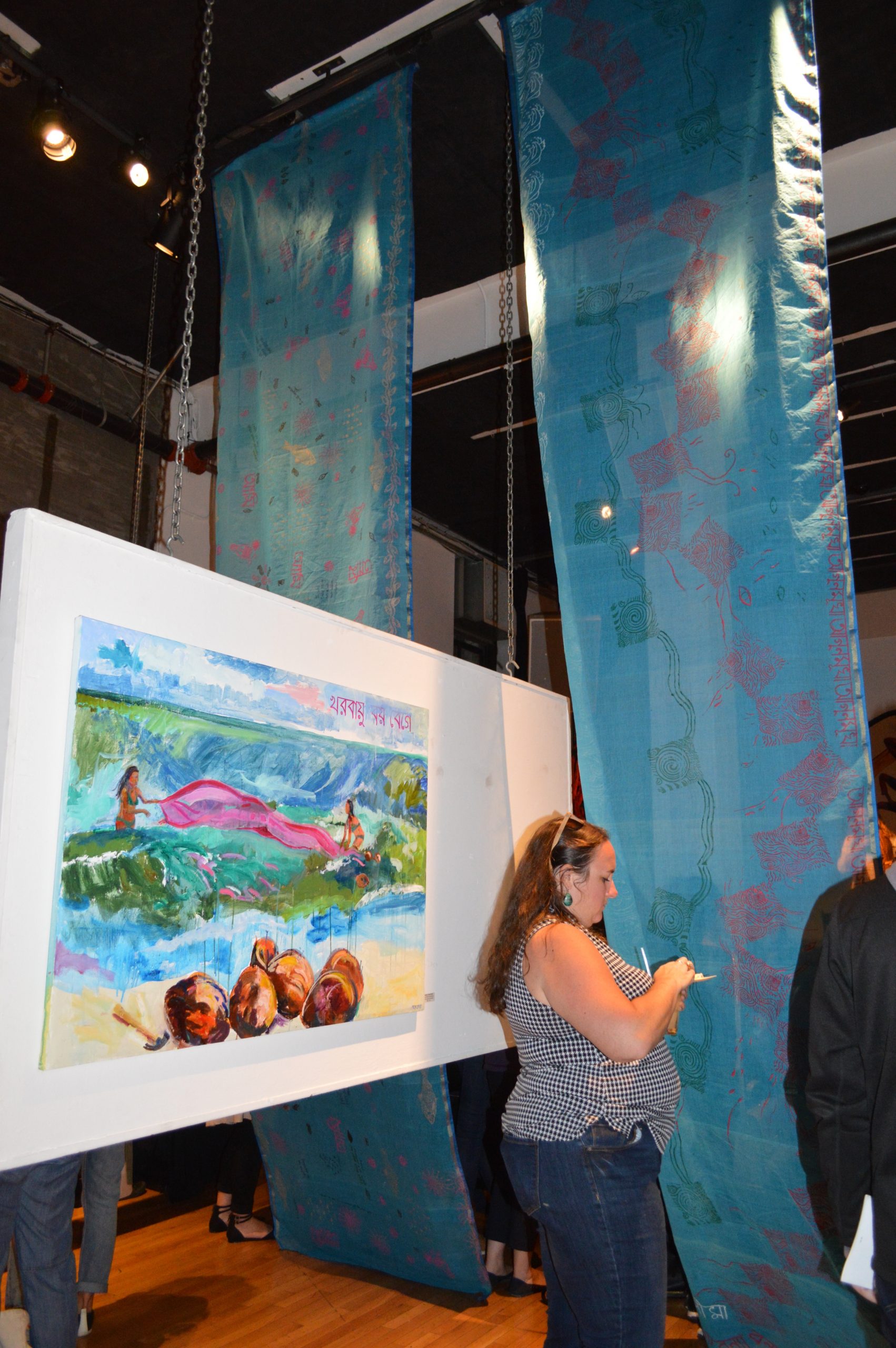 “We are not drowning. We are thriving.” This was the chant at the end of the evening. Almost 200 people gathered together for four hours on September 13, 2018 to highlight women’s leadership in addressing climate change, an event hosted by the Sierra Club’s Gender Program and Women’s Environment and Development Organization (WEDO) in conjunction with the Global Climate Action Summit organized by California Governor Jerry Brown. The venue was 111 Minna Gallery, a dramatic art space that was perfect for hanging the 18-foot-long Storytelling with Saris climate saris. Two saris on display were made in collaboration with Sierra Club’s Youth Activists during their trips to Washington DC in 2016 and 2017. The third sari was made in collaboration with women from Katakhali Village, Bangladesh. During the evening, attendees made individual climate pledges on a cotton handloom sari, which will ultimately be returned to Bangladesh and worn by a woman on the frontlines of climate change in Katakhali Village, Barobaishdia Island.