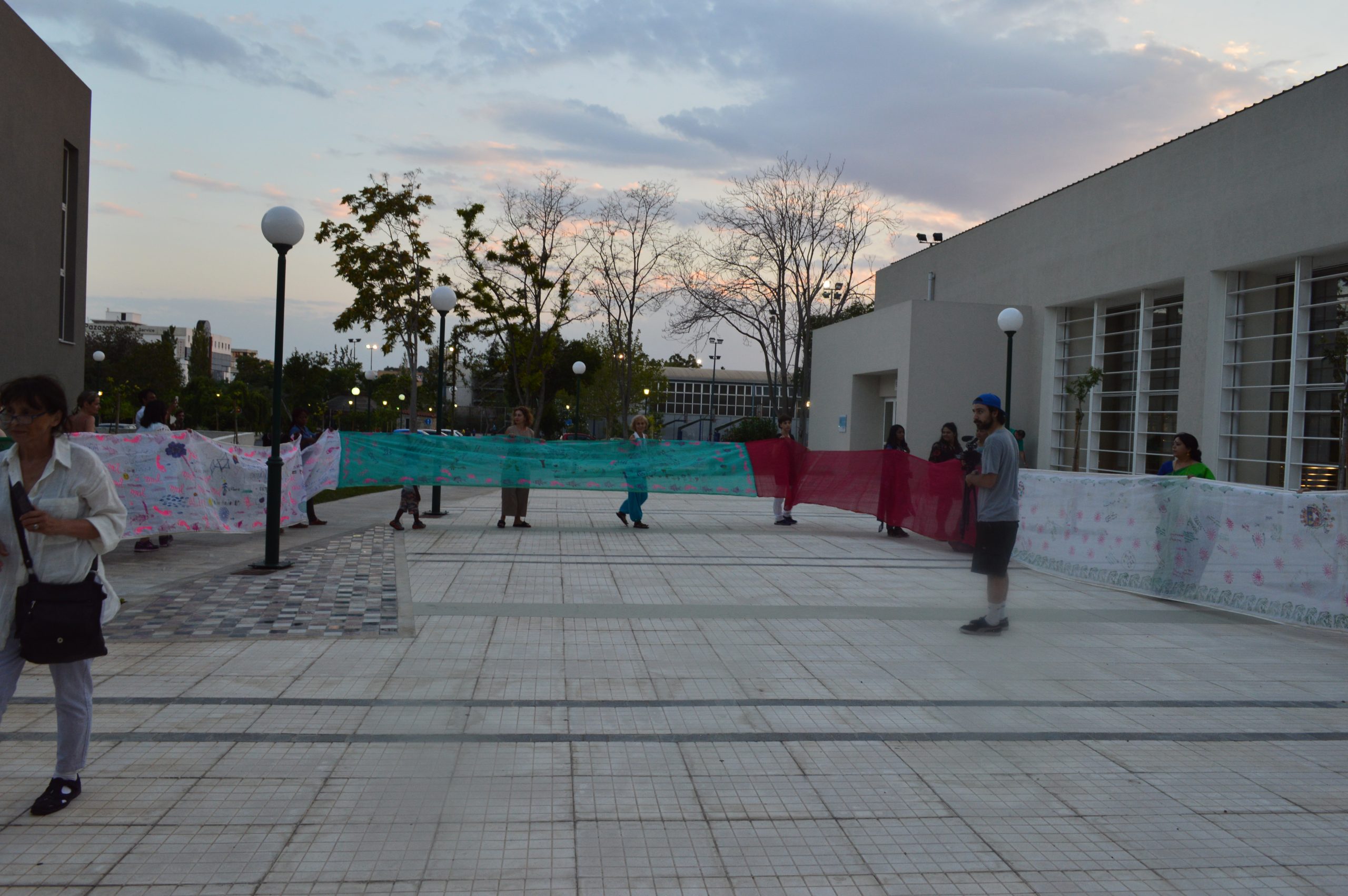 The performance begins in the sari “dwelling” with singing in Bengali and Greek (songs about storms and the sea). We write personal reflections on “home” on the glass windows in multiple languages. We lift a sari up to make a roof and six women (and more join in) walk around with the sari roof over our heads. We sew together saris that contain the stories and writing of people in Athens, Paris, Bangladesh, and the US. I pour salt over a plate of rice, referencing the impact of climate change on agriculture by incursion of salt water into the soil, water, and crops in coastal areas. I ladle water from one vessel to another to suggest sea level rise. I light a candle to symbolize the overheating of our planet and the fires that rage across our globe. We walk in a procession and carry the long sari banner outside the gallery as Bangladeshi immigrants sing a song about marching alone if no one joins you (Ekla Cholo Re) . As we walk outside to the streets, we pass graffiti, cars, a church, and, in a poignant moment, we encircle a homeless couple sitting in a makeshift home.
