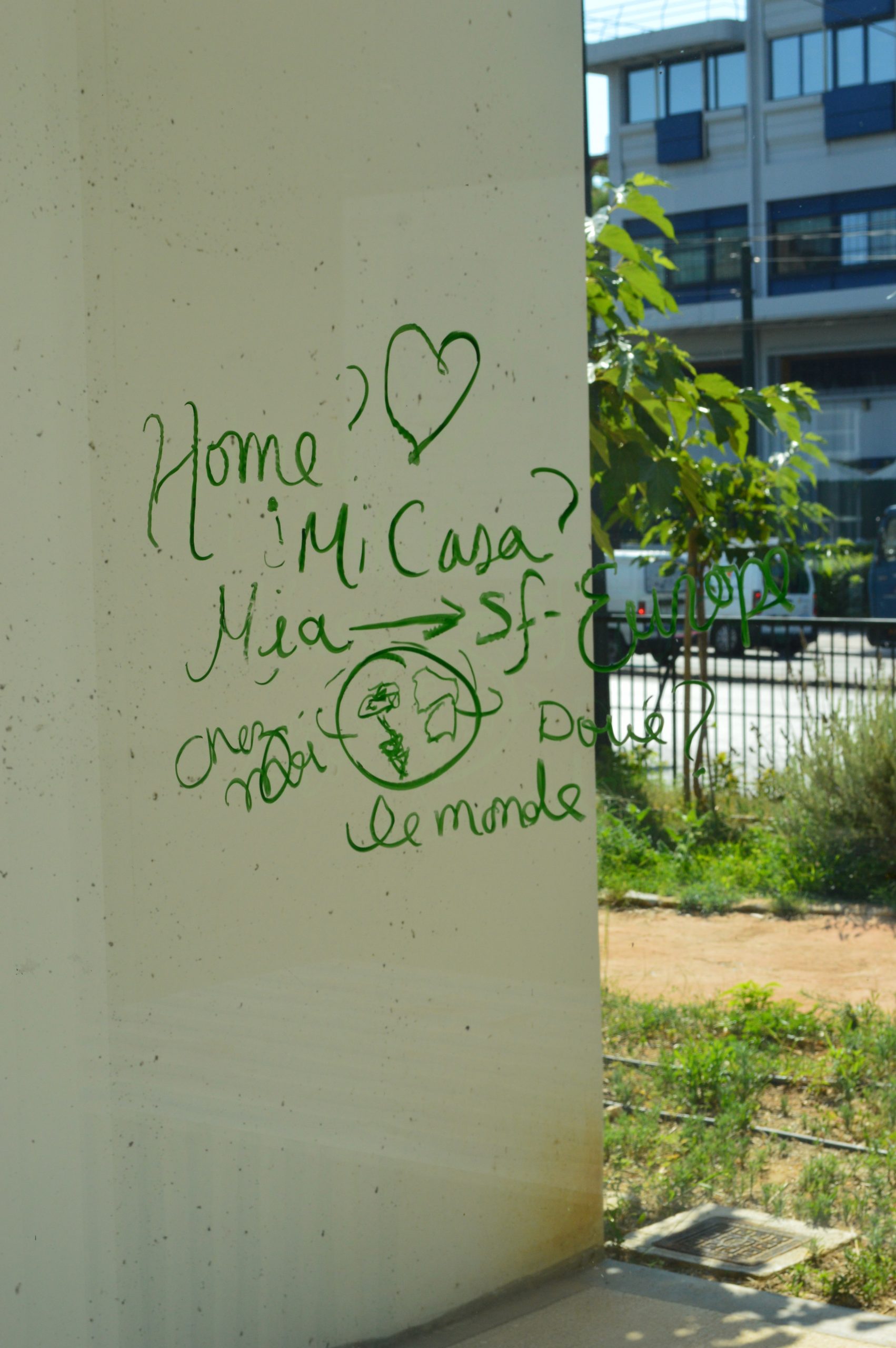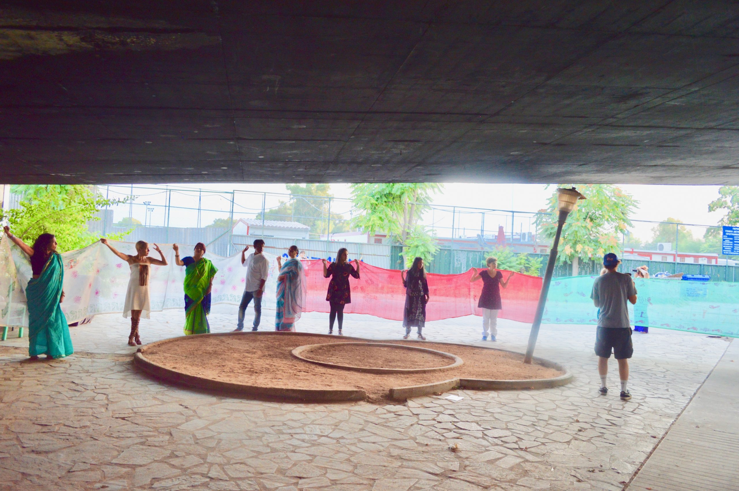 The performance begins in the sari “dwelling” with singing in Bengali and Greek (songs about storms and the sea). We write personal reflections on “home” on the glass windows in multiple languages. We lift a sari up to make a roof and six women (and more join in) walk around with the sari roof over our heads. We sew together saris that contain the stories and writing of people in Athens, Paris, Bangladesh, and the US. I pour salt over a plate of rice, referencing the impact of climate change on agriculture by incursion of salt water into the soil, water, and crops in coastal areas. I ladle water from one vessel to another to suggest sea level rise. I light a candle to symbolize the overheating of our planet and the fires that rage across our globe. We walk in a procession and carry the long sari banner outside the gallery as Bangladeshi immigrants sing a song about marching alone if no one joins you (Ekla Cholo Re) . As we walk outside to the streets, we pass graffiti, cars, a church, and, in a poignant moment, we encircle a homeless couple sitting in a makeshift home.