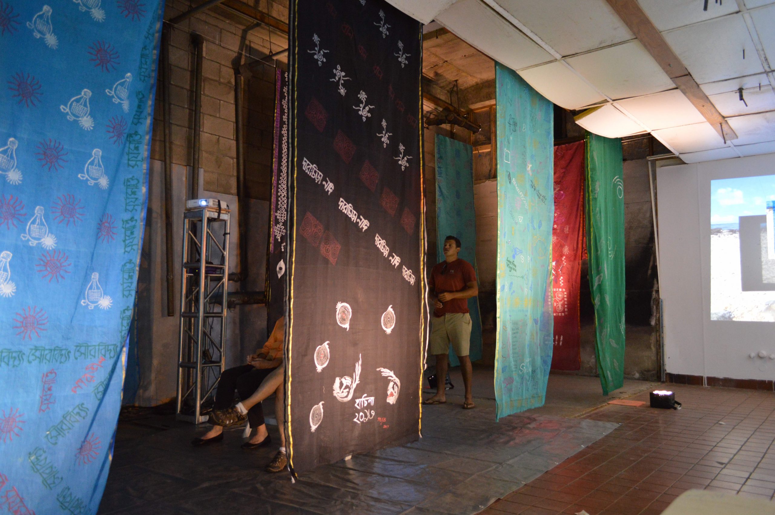 Climate change is destroying the heritage and homelands of island and coastal peoples across the world. Richer countries of the Global North continue their historic disregard for the cultures, language, land, and even the rights to exist of those they regard as “other.” RECLAIM highlights language and culture as core components of identity and expression that can serve as tools of innovation and resilience in the area of climate change. Through an immersive video/sari installation, a series of workshops, and a community performance, RECLAIM seeks to inspire and empower viewers to reclaim heritage, language, and our connection to the earth to fight climate change. Twelve 18-foot-long saris hang vertically like columns in the raw industrial space in the back of the former supermarket, with another sari laid out on a long table for viewers to write and draw on. With multiple video projections, the dark room is filled with the sound of water and the voices of Bangladeshi coastal women speaking about the impacts of climate change. Hundreds of visitors learn about the impact of climate change on island and coastal communities and make carbon reduction promises on two Climate Pledge Saris, to be returned to Bangladesh to be worn as garments by coastal women.